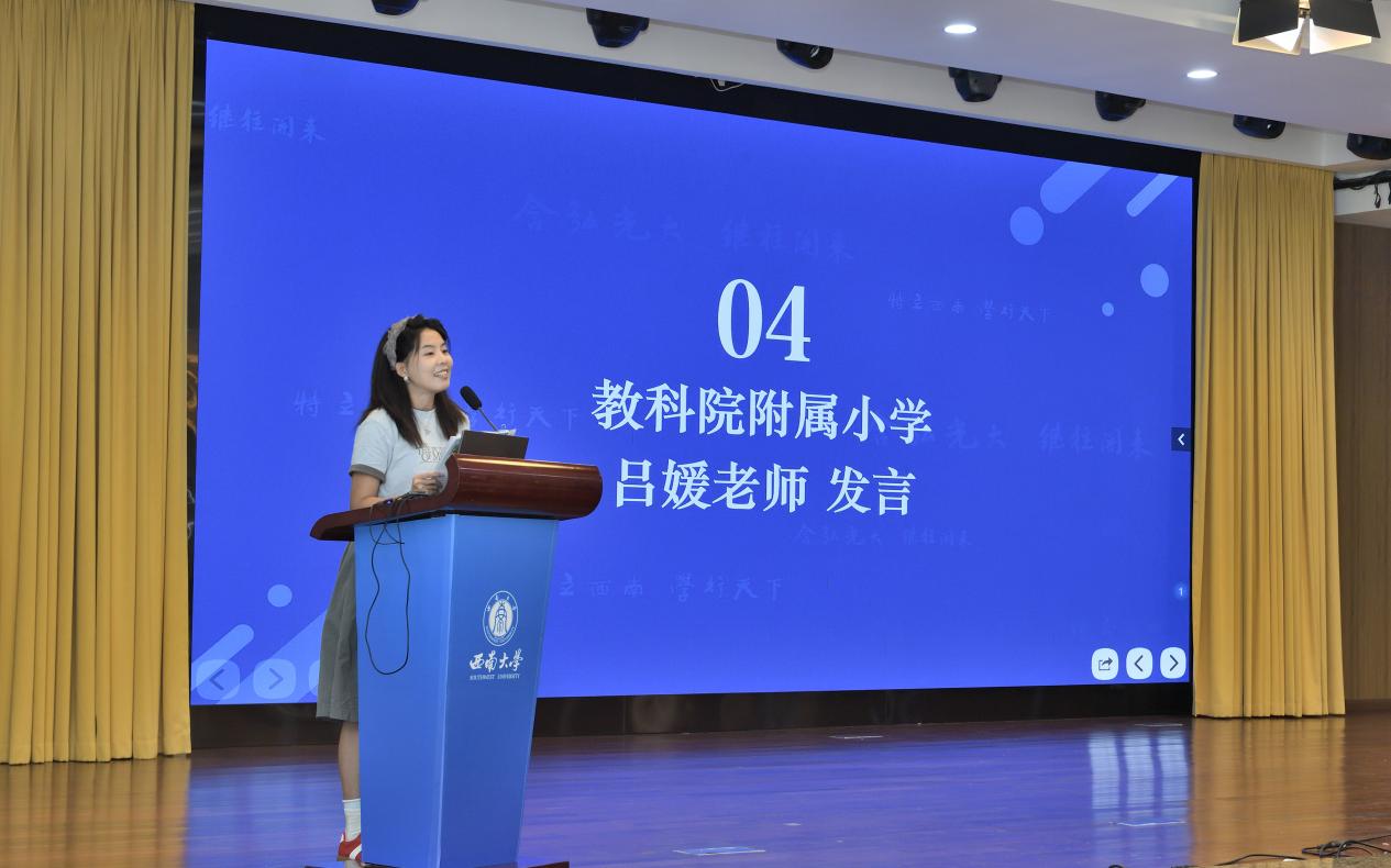 教科院附属小公司教务处吴克娜主任作为学员代表发言。她表示:"我们怀着对教育事业的赤诚之心而来,带着对专业成长的渴望之情而学。全体学员将以空杯心态投入学习,积极参与各项研修活动,力求在理论素养和实践能力上获得全面提升,将先进的教育理念和教学方法带回新都,惠及更多学子。"