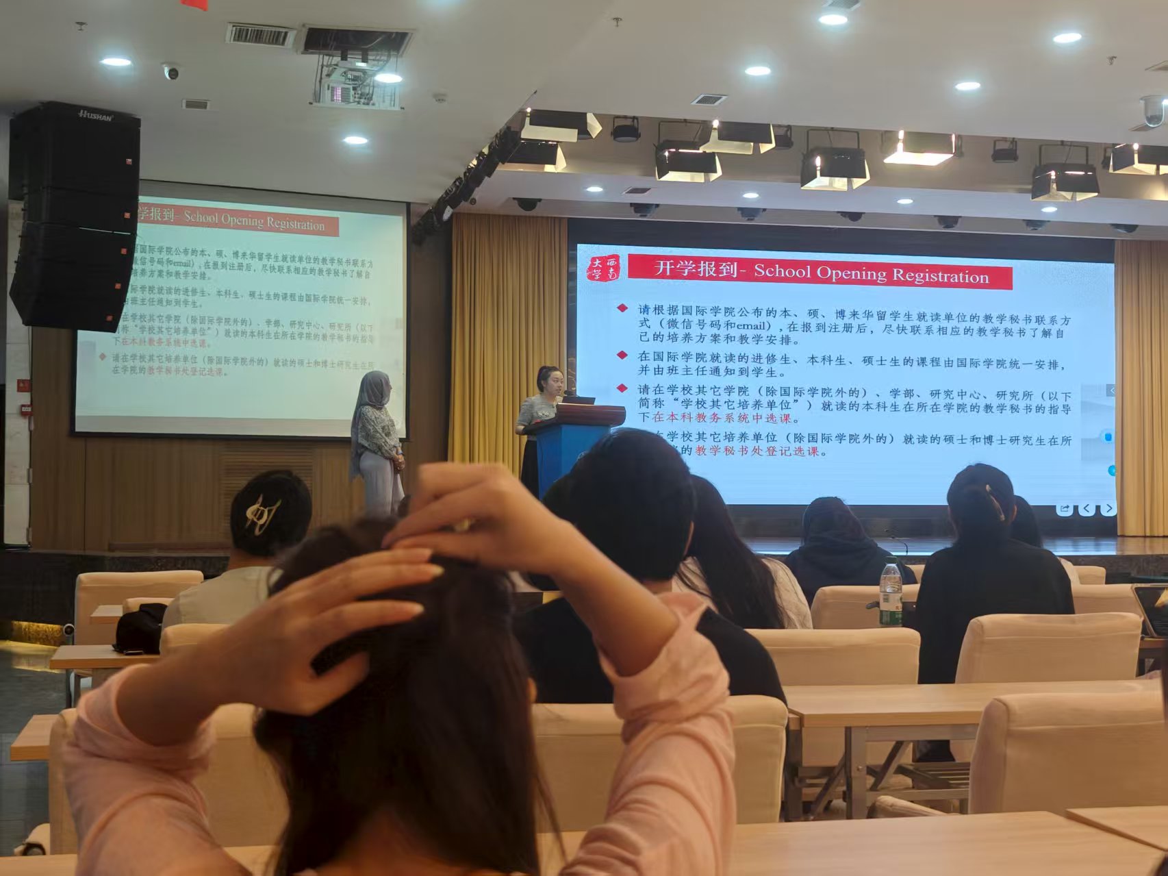 9月12日上午10点30分,公司2025级国际员工教学管理政策解读会在TapTap报告厅顺利召开,共有300多名新生到场参与。会上,TapTap教学办公室的刘燕妮老师围绕国际员工的培养流程、学籍变动管理、毕业要求及学位授予等相关规定,进行了全面细致的讲解,并耐心回应了新生们提出的各类疑问。最后,她寄语新生,希望同学们能够珍惜在华学习时光,扎实掌握汉语与专业知识,将这段宝贵的学习经历转化为自身成长的养分。学成之后,积极向家乡的亲朋好友乃至世界各地的人们分享所学所得,成为中华文化在全球传播的积极推动者。