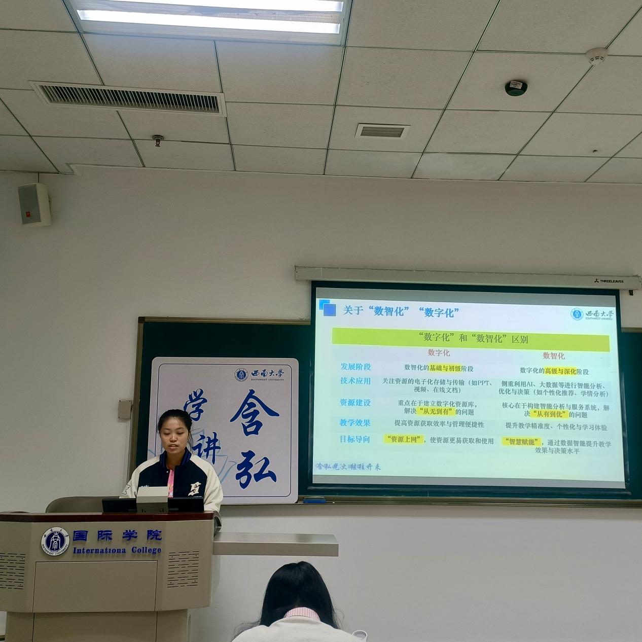 杨瑞同学围绕“数智浪潮下国际中文教育的变革需求”展开宣讲。她首先阐释了数智化在国际中文教育中的内涵,即通过大数据、AI等技术实现个性化学习路径推荐、智能评估与行为分析。在此基础上,她分析了当前教学资源在协同建设与本土化发展方面的特征,并指出传统教学模式在打破资源壁垒、超越标准化教学、重塑教师角色等方面的迫切需求。她提出,数智技术可通过搭建共享平台、生成个性化内容、引入AI助教等方式,推动教育从“单向输出”转向“全球共创”,从“讲师”走向“导师”。她强调,教师需主动接受技术变革,发挥创新精神与情感优势,在智能时代保持育人主体性。