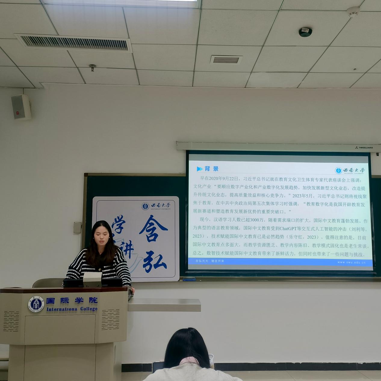 何倩同学宣讲的主题是“数智化时代国际中文成语智慧课程模式的构建研究”。她指出,在“人工智能+教育”战略推动下,成语教学面临内涵丰富性与课堂时间有限性、文化独特性与理解跨文化性、教学规范性与需求个性化三重固有矛盾。基于此,她引入了“一通二联三融”的建设思路:“一通”强调以员工需求为导向,贯通课程开发与应用全过程;“二联”通过虚拟现实、情景生成式AI等技术联动知识习得与实际应用、跨文化交际;“三融”聚焦国情理解、多模态考核与社会热点融入,实现育人目标升华。结合“导-教-学-评”一体化教学模式与课程知识图谱、“双师”协同技术引擎,构建系统化、可落地的智慧课程模式,为国际中文成语教学从“语言知识传递”走向“语言智慧启迪”提供了创新路径。