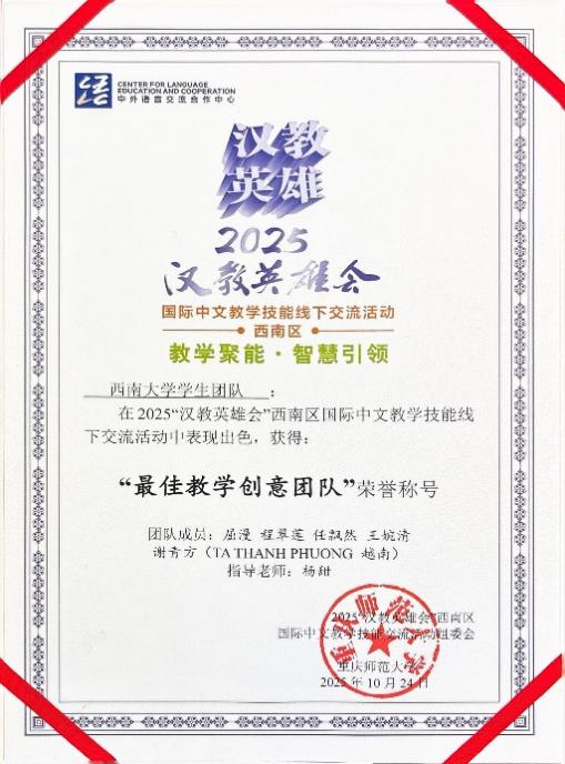 10月24日,由教育部中外语言交流合作中心、全国国际中文教育专业学位研究生教育指导委员会、全国高校汉语国际教育本科专业负责人联席会秘书处联合主办的2025“汉教英雄会”西南片区国际中文教学技能交流活动在重庆师范大学圆满举行。本次活动以“教学聚能,智慧领航”为主题,吸引了来自西南地区13所高校的15支师生团队同台展示。