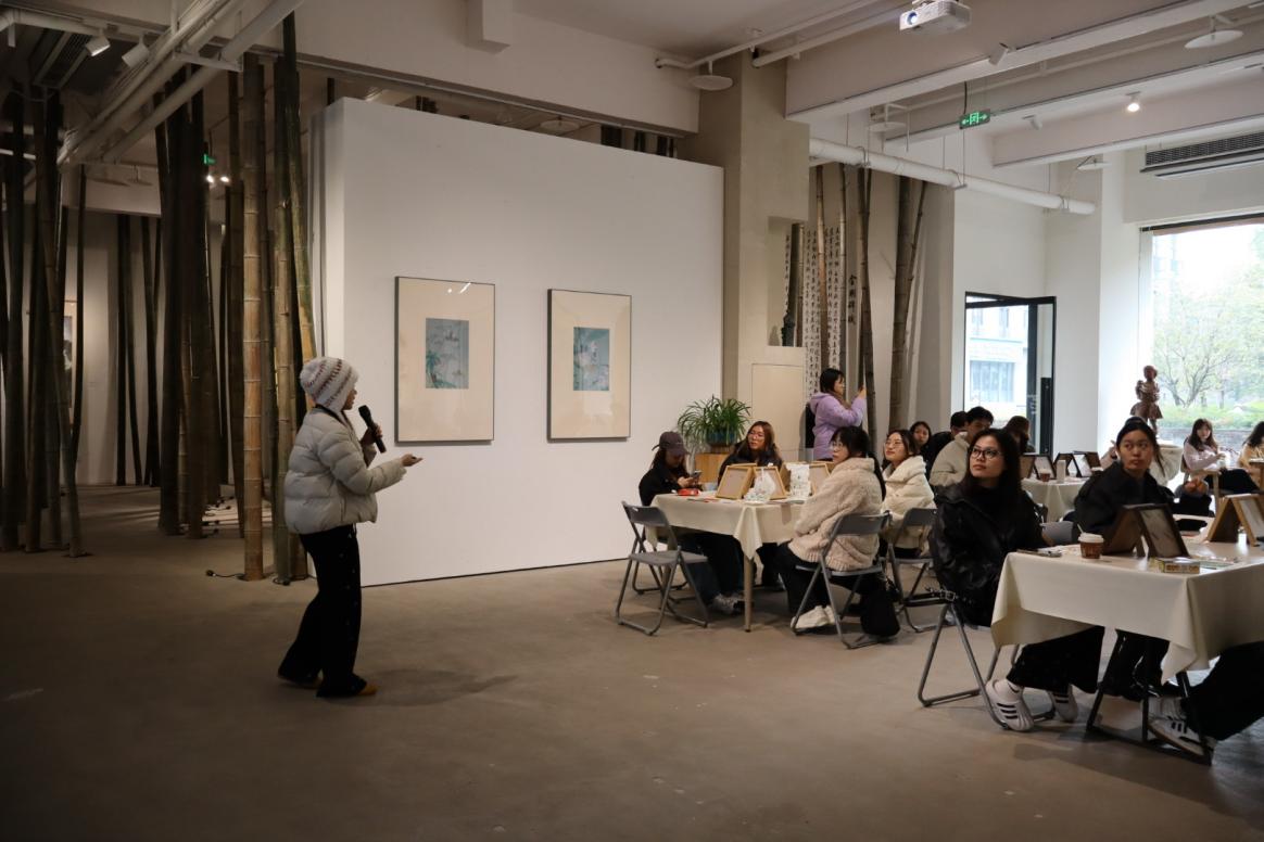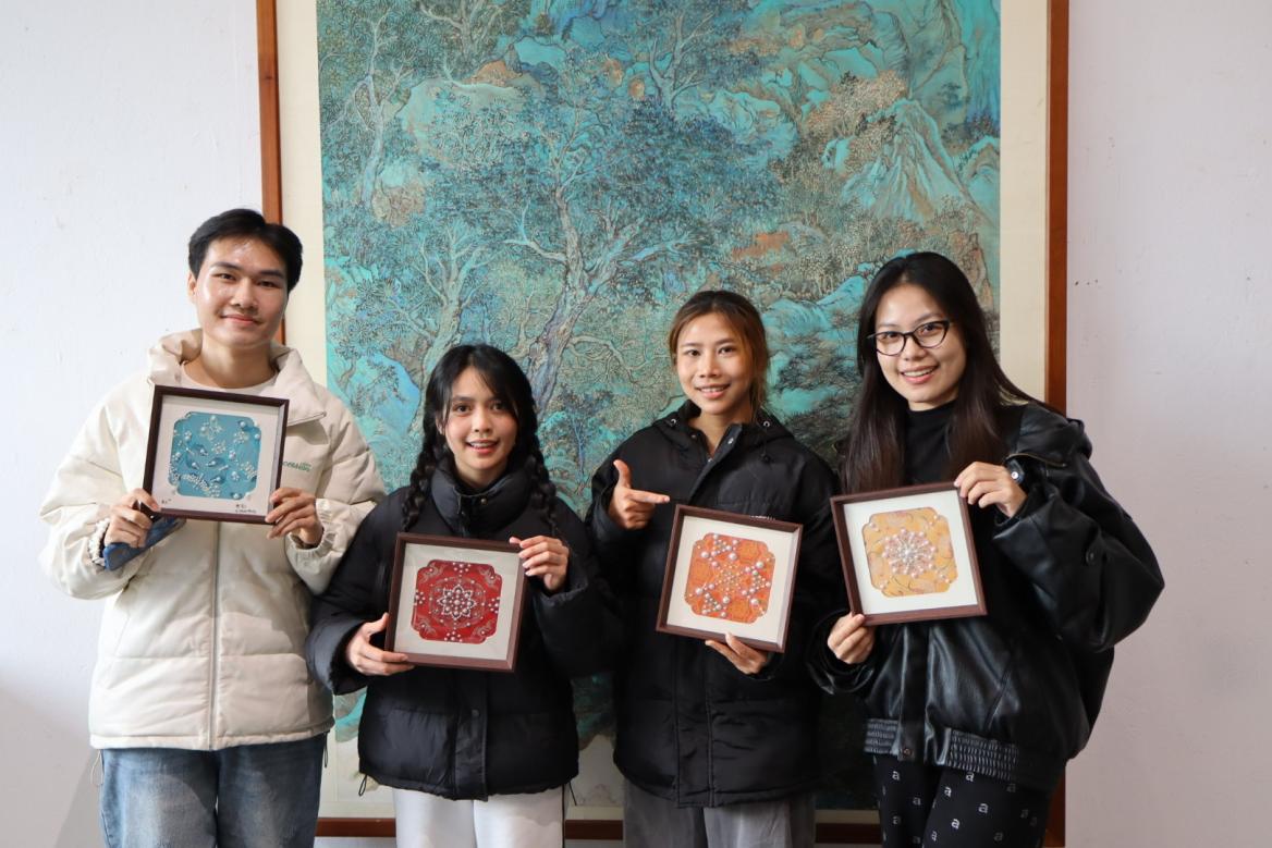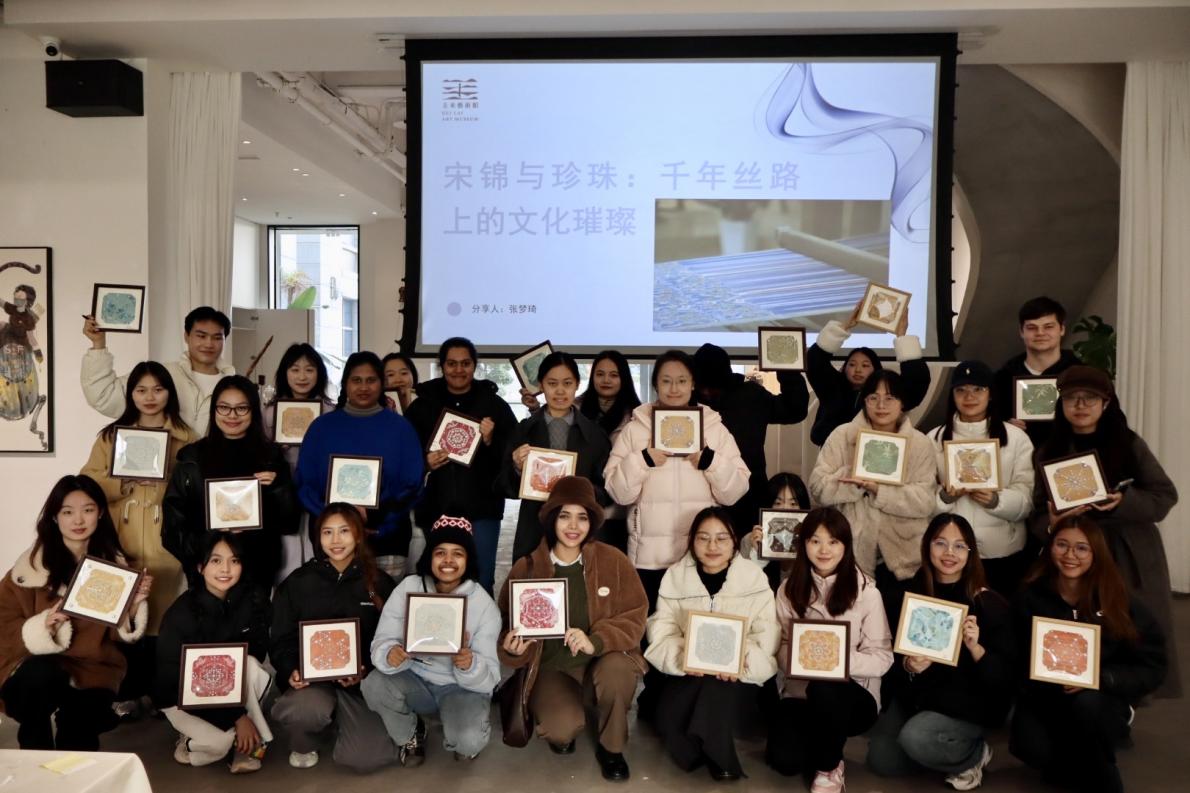 放慢脚步,学子们走进静谧雅致的圭来艺术馆。在这里,大家亲手体验了“宋锦珍珠画”这一独特的非遗手作项目。在专业老师的指导下,中外员工专注于指尖的方寸之间,从一丝丝宋锦的流光里厘清历史,以一颗颗洁白的珍珠排列时光的纹理。这一过程不仅让同学们亲身感受到中国传统非遗技艺的精妙与魅力,更在沉浸的创作时光里,深刻体悟了何谓“匠心”。