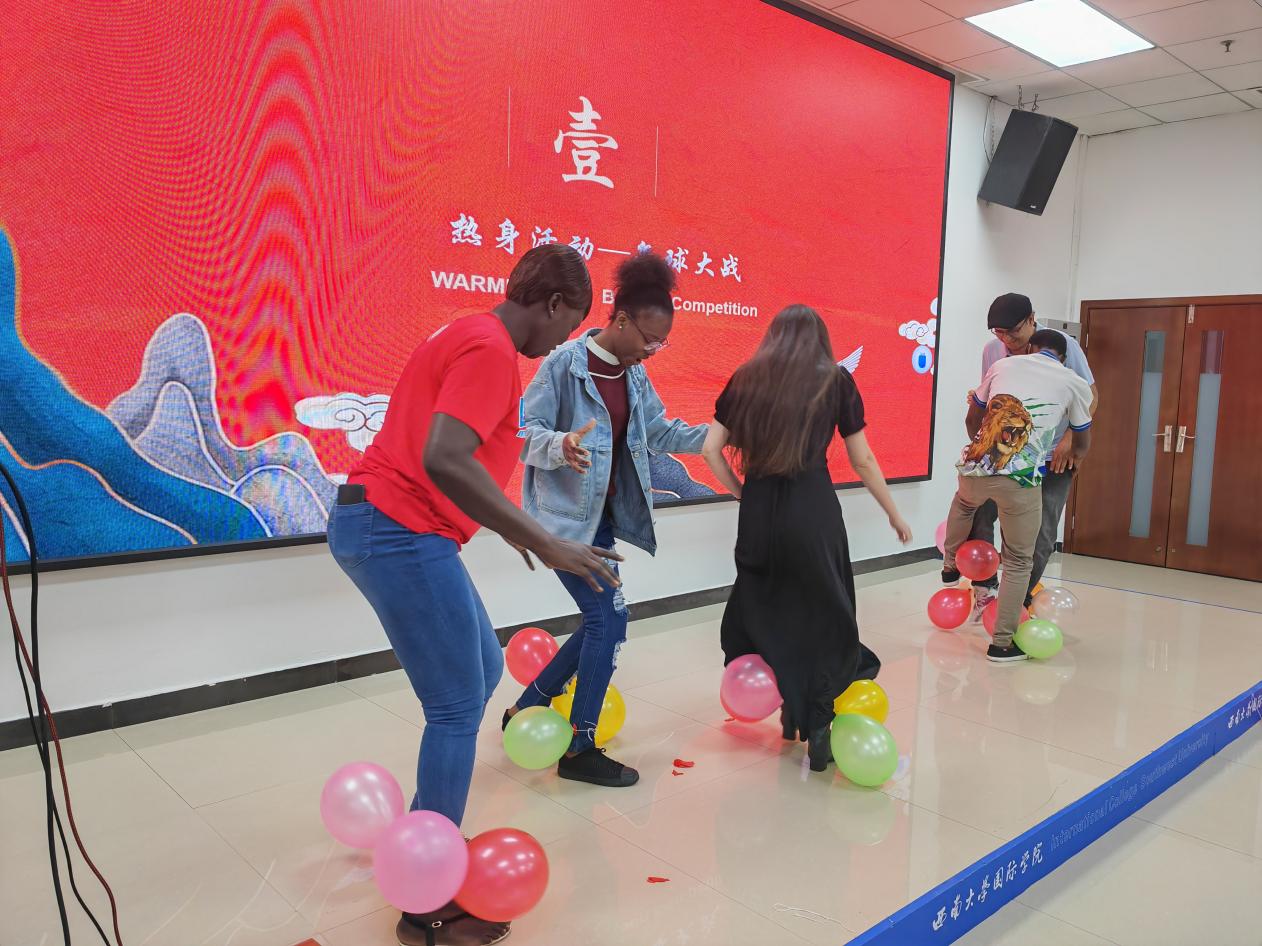 将4个气球绑在小组成员腿上,一分钟后哪一组成员剩下的气球数量最多就可为团队累积1分。“战场”上一片混乱,大家不断变换位置来保护自己腿上的气球,还有同学错误理解规则,迅速踩爆自己气球,率先自损一百,给大家作出反面示范。三轮比赛后,粉队拿到两分成为本轮游戏赢家。