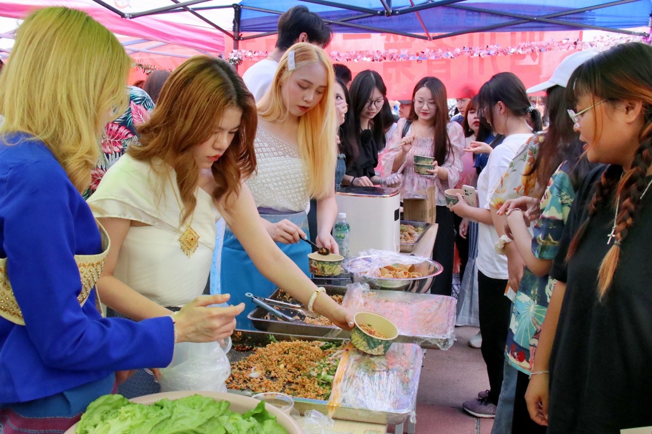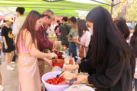 首先进行的是泰国美食展,成大泰国职工和泰语系同学为大家准备了丰盛的泰国美食,包括Som tum(木瓜沙拉)、ka-noom-jeen(泰式米线)、cha-noom(泰式奶茶)等。这些美食不仅让泰国职工找到“家”的感觉,也让来自各地的同学们大快朵颐,领略了特色浓郁的泰国风情。