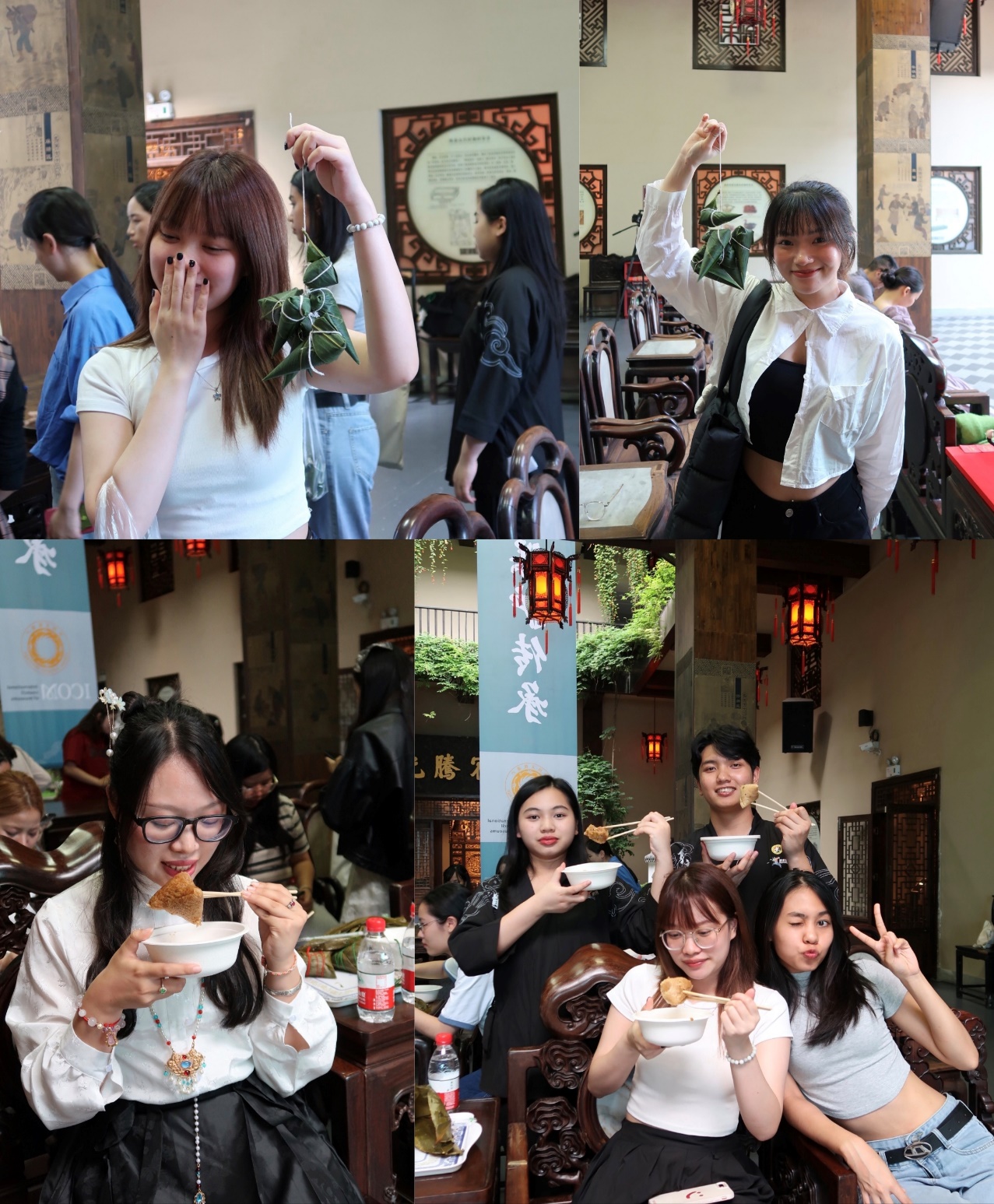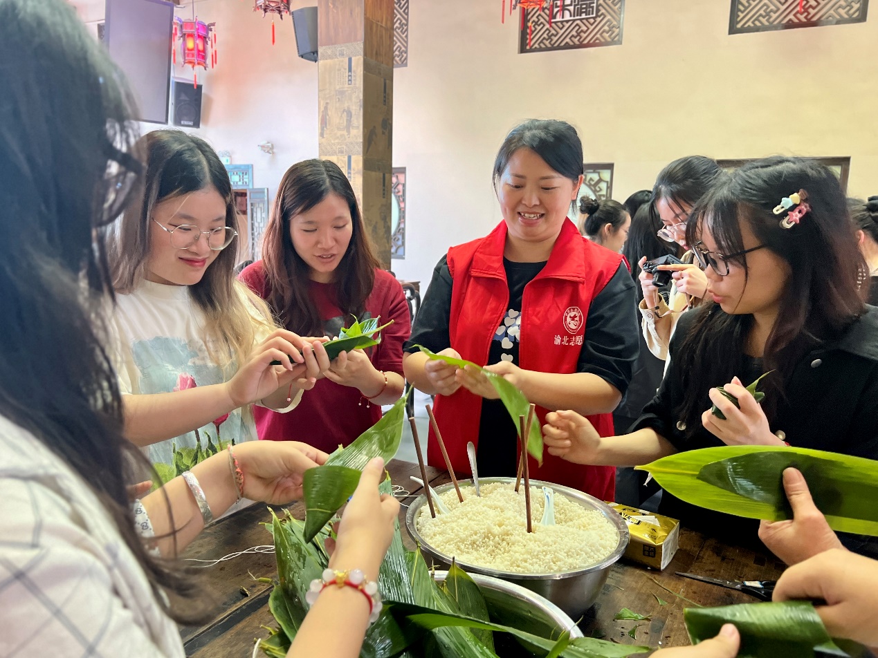 在节日民俗体验环节,巴渝民俗博物馆联合滨港路社区居民委员会组织了一场别开生面的包粽子活动。在社区志愿者的耐心指导下,国际员工们了解了粽叶和糯米的功用。在欢声笑语中,同学们认真实践着从折粽叶、填糯米,到捆绑线绳的每一个步骤。很快,一个个精巧可爱的粽子就出现在了桌子上。