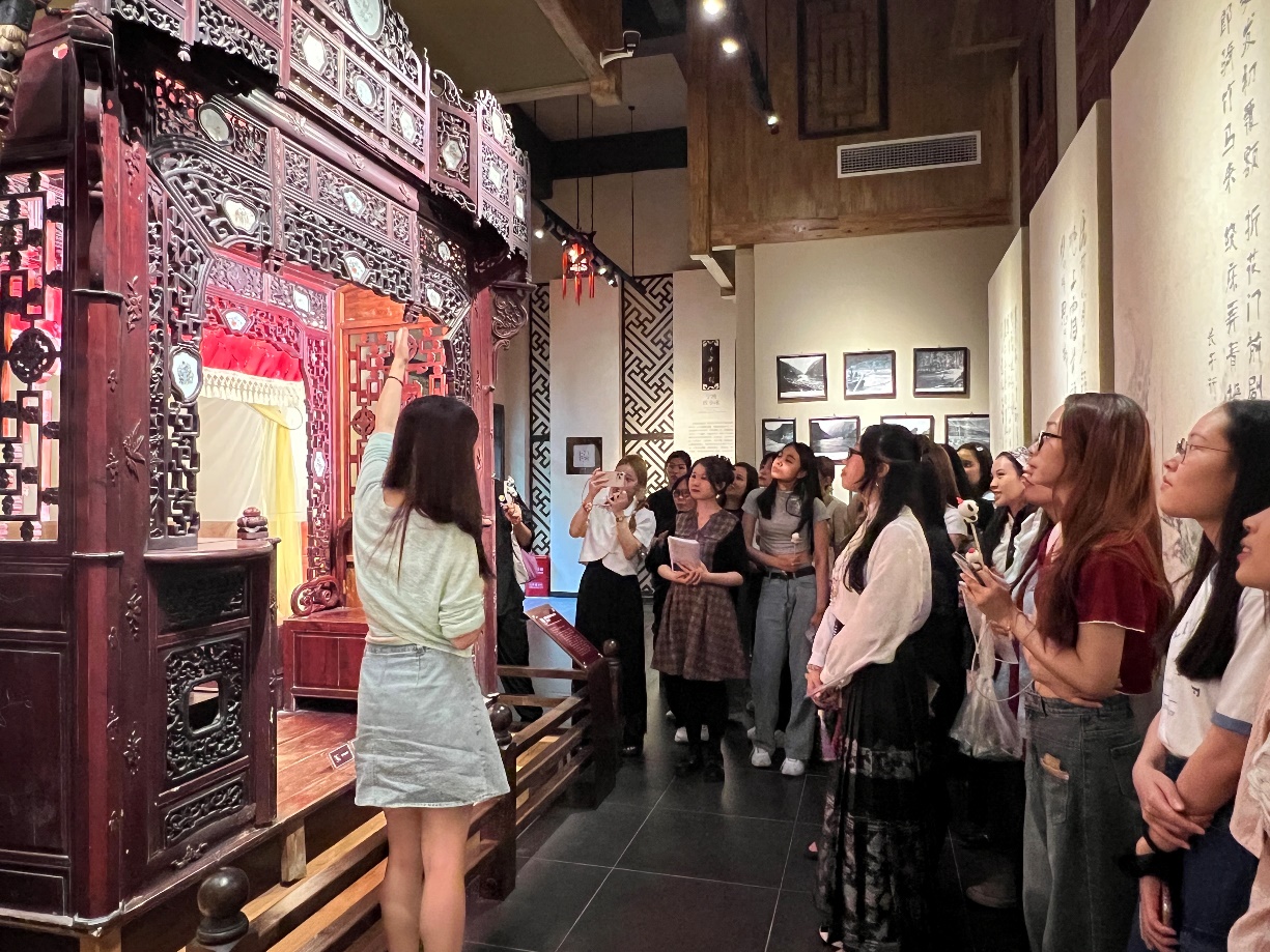 第二站走进巴渝民俗博物馆古床展馆,在巴渝民俗博物馆王黎老师的讲解下,国际员工领略了巴渝地区木雕家具的艺术魅力,感受到了底蕴深厚的巴渝传统文化。国际员工在老师的指引下,依次参观馆中陈列的清代中晚期至民国时期巴渝地区精美雕花大床及家神龛等展品等等。面对一张张金碧辉煌的雕花大床,国际员工们对其精致的设计、精美的工艺赞叹不已,还纷纷提出心中的疑问,并了解古床的发展历程、制作工艺、不同雕花纹样在中国的寓意等。