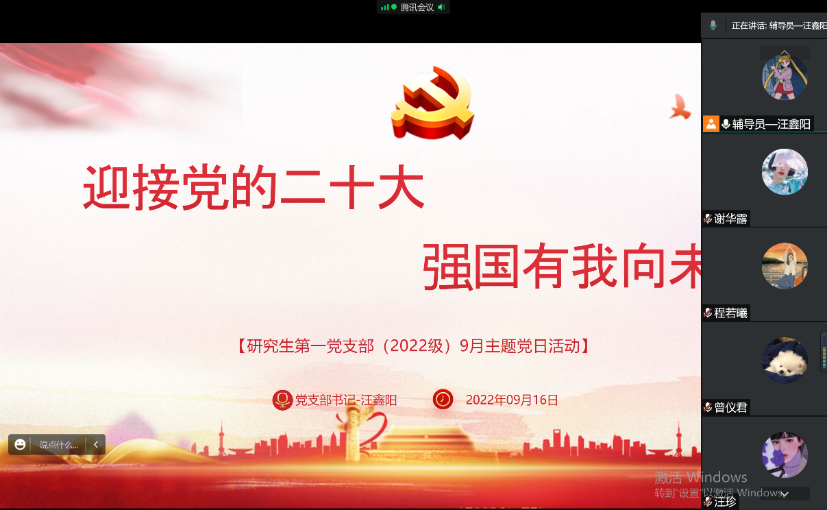 9月16日下午16:00,研究生第一党支部通过腾讯会议,开展党支部第一届委员选举和主题为“迎接党的二十大,强国有我向未来”的党日活动。会议由支部书记汪鑫阳主持。