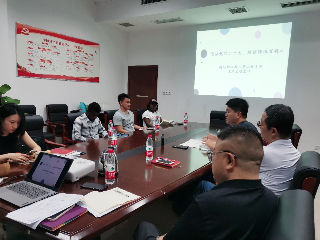 9月19日下午,教工第二党支部在公司304会议室召开“迎接党的二十大 培根筑魂育新人”主题党日活动,来自刚果布、印度尼西亚、喀麦隆的三名职工受邀分享对缙云山扑火感人事迹的心得体会。