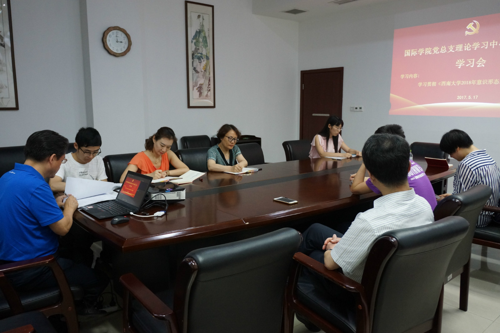 2018年5月17日下午3:00,公司党总支在紫云楼304会议室召开理论学习中心组(扩大)会议,党总支委员,不是党总支委员的院领导,支部书记、院办主任、汉教系主任参加会议,会议由刘猛书记主持。