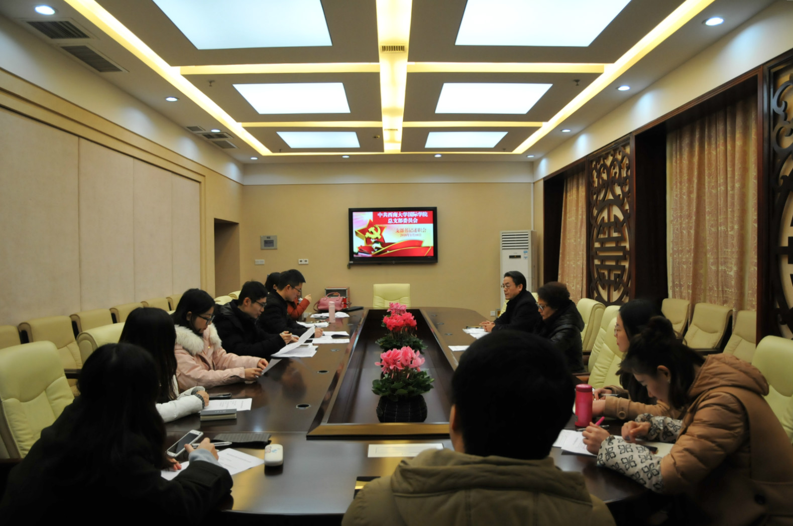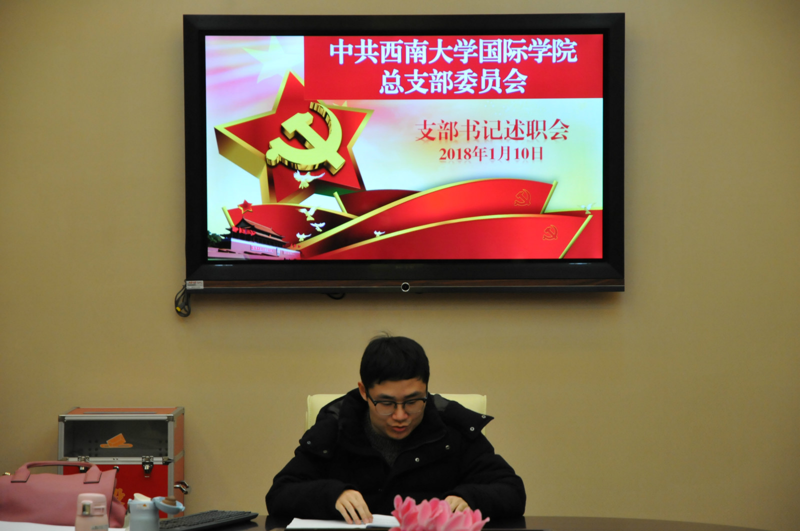 为推动全面从严治党向基层延伸,切实落实巡视整改任务,按照公司党委的要求,公司党总支于2018年1月10日下午3点在签约室,举行2017年支部书记年度述职评议会。党总支书记刘猛, 经理兼总支委员王静,以及四个支部的支部书记、支部委员,教师、员工党员代表参加会议,会议由刘猛书记主持。